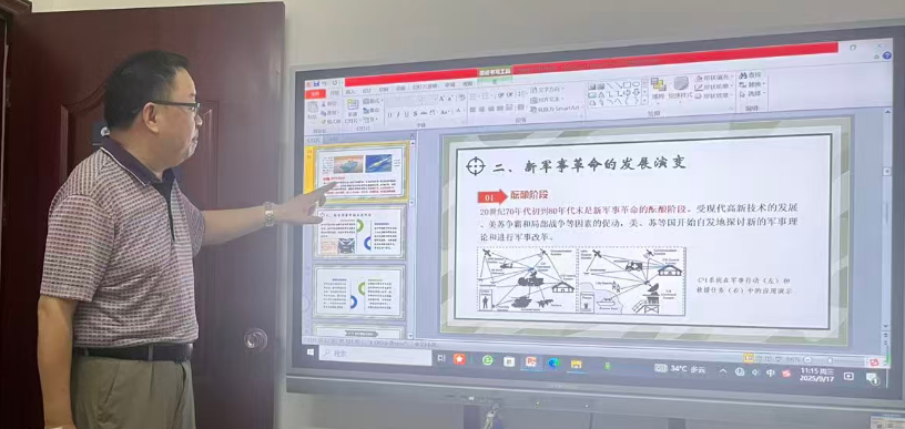 王铭杰结合近期典型战例剖析了现代战争的特点、形态与发展趋势。敖文文则围绕“信息化装备”专题介绍了世界主要国家武器装备信息化、智能化发展现状,并解读了我军装备体系建设成就与发展方向;同时提出要主动关注国内外军事动态,建议教学设计环节融入巴以冲突、巴印冲突、“九三阅兵”等鲜活素材,使教学内容紧跟时事政策。